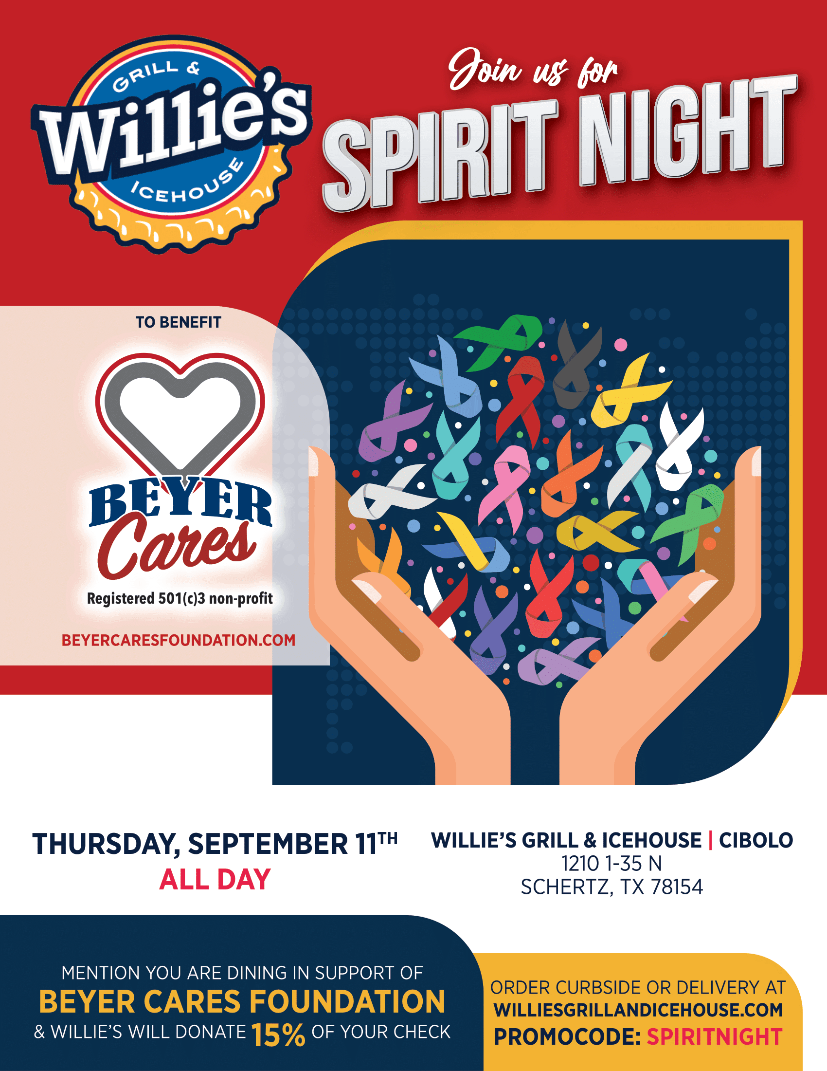 Join us for our next Willie’s Spirit Night in September 2026. When ordering, mention “Beyer Cares Foundation” to donate 15% of your check to the organization.